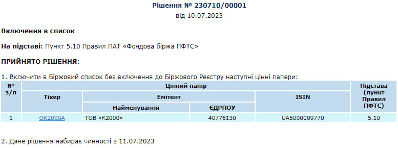 Фондова біржа ПФТС включила в біржовий список облігації ТОВ "К2000" серії А