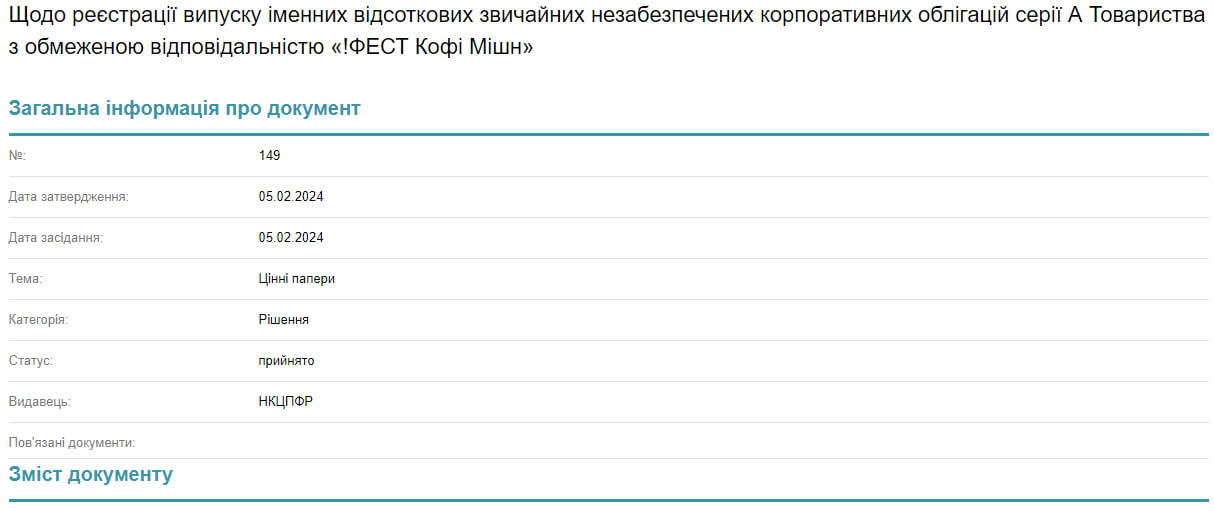 НКЦПФР зареєструвала випуск облігацій !ФЕСТ Кофі Мішн серії А